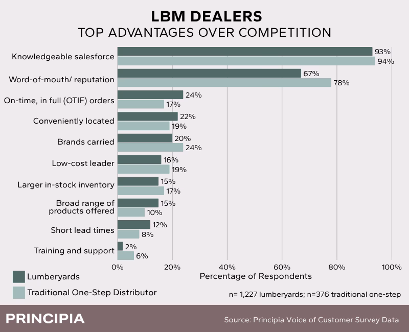 What may surprise some is just how far down the list other factors rank. The brands dealers carry and the breadth of their in-stock inventory—often assumed to be key differentiators—are not viewed as major sources of competitive edge. This holds true across dealer types, from lumberyards to traditional one-step distributors.