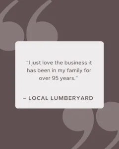 - “I like that it is small town business. I have been here forever and know the clientele. It’s not the atmosphere of a big box.” – Local Lumberyard