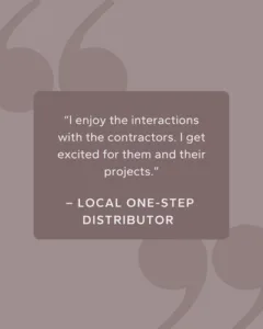- “The people I enjoy most. I enjoy helping them with their projects and watching them see projects from beginning to end.” – National One-Step Distributor
